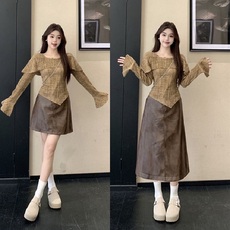 大码胖mm美拉德不规则喇叭袖针织衫上衣半身裙女秋冬显瘦两件套装