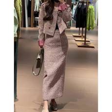 大码显瘦高级感小香风套装女秋冬胖mm加厚毛呢短外套半身裙两件套