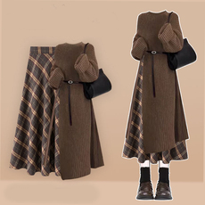 DEMA小德玛学院风假两件针织毛衣秋冬套装胖MM百褶裙大码微胖显瘦