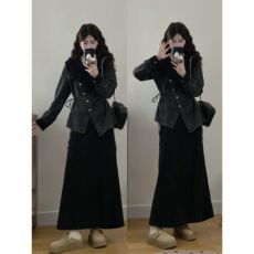 新品大码女装美拉德牛仔拼接外套秋冬灯芯绒半身裙套装胖mm显瘦