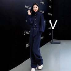 2025秋冬季大码胖mm巨显瘦套装藏蓝色高领毛衣灯芯绒阔腿裤两件套