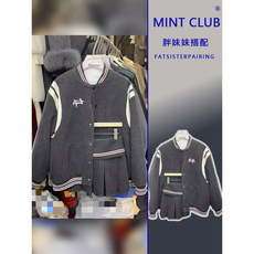 大码复古风时尚棒球服外套女胖mm秋冬新款高腰显瘦百褶裙两件套装