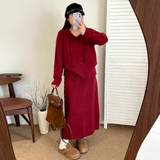 大码高级感套装女秋冬polo领红色针织毛衣胖MM显瘦半身裙子两件套