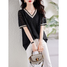 加肥钉珠V领网纱短袖收腰小衫休闲裤胖妹妹黑色显瘦通勤风两件套