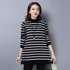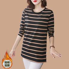 秋冬季新款大码女装半高领加绒加厚保暖中长款长袖打底衫上衣条纹