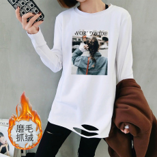 长袖t恤女秋冬韩版宽松大码女装中长款加绒加厚磨毛上衣服打底衫
