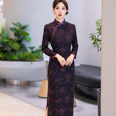 宴会礼服2022秋冬新款色金丝绒长款七分袖大码时尚改良婆妈妈旗袍