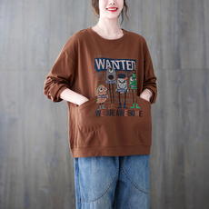 秋冬款休闲套头衫圆领印花大码宽松口袋长袖卫衣上衣女~外贸尾货