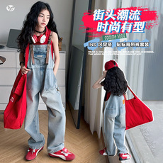 女童背带裤套装2025夏季新款中大童美式复古背心贴标牛仔裤