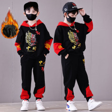 韩版男童套装春秋冬装中大童加绒加厚两件套初中学生潮条纹运动服