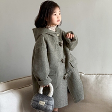 韩系童装100%双面羊毛大衣男童女童连帽中长款牛角扣中大童呢外套