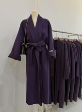 2025年冬季紫色双面羊毛大衣女中长款韩版系带收腰显瘦羊毛呢外套
