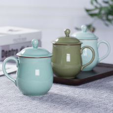 龙泉青瓷办公杯带手柄陶瓷个人用水杯带盖商务会议大容量泡茶杯子
