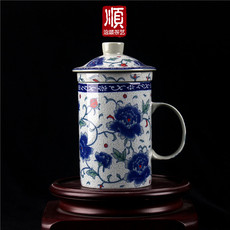 景德镇青花玲珑过滤杯高档办公茶杯会议杯大容量带盖茶水分离杯