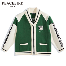 太平鸟男装撞色翻领毛开衫秋季拼接运动潮流毛衣休闲外套