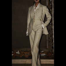 羊毛西装秋冬三件套复古毛呢米色外套大衣马甲长裤毛呢阔腿裤套装
