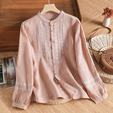 新中式复古棉麻长袖茶服衬衫女秋季宽松国风刺绣斜襟盘扣唐装上衣