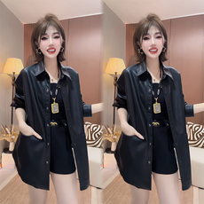 春秋新款黑色PU皮衬衫外套女宽松显瘦中长款通勤休闲百搭气质皮衣