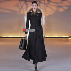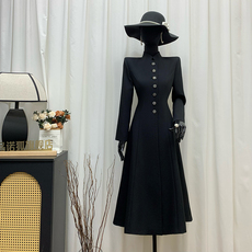 品诺狐黑色A字摆长款风衣外套秋季新品收腰修身显瘦立领女士大衣