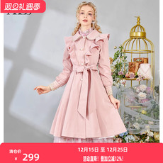 艾丽丝2025冬季新款粉色甜美修身显瘦蝴蝶结绑带中长款风衣外套女