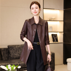 海宁2025春秋新款真皮皮衣女中长款绵羊皮单排扣修身显瘦风衣外套