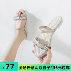 宽胖脚大码女鞋41一43夏外穿时尚透明水钻凉拖鞋粗跟仙女风一字拖
