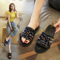 凉拖鞋女外穿ins潮粗跟珠钻沙滩鞋胖脚宽脚女拖鞋R大码41一43夏款