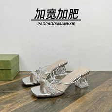 胖脚宽肥大码女鞋41到43凉拖外穿水钻水晶粗跟夏季加宽加肥4445