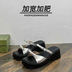 胖脚宽肥大码女鞋41到43银色凉拖夏季配裙子厚底蝴蝶结加宽加肥