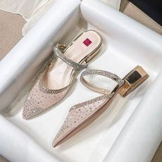 粗跟包头半拖鞋女夏外穿水钻闪亮凉拖低跟气质尖头大码凉鞋41一43