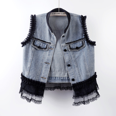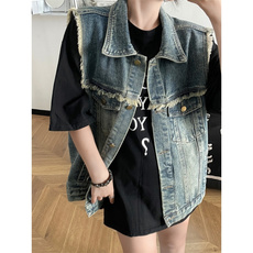 黑色牛仔背心马甲短款女士春秋宽松百搭休闲毛边无袖马夹坎肩外套