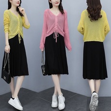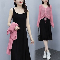 早春连衣裙2023年新款时尚洋气中长款夏裙镂空针织系带两件套装女