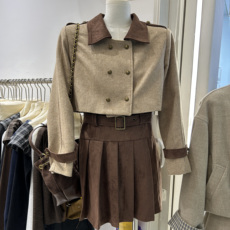 复古撞色短款小香风外套内搭百褶裙吊带背心两件套时尚小个子套装