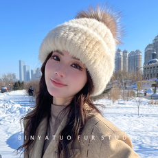 新款水貂皮草女帽子冬季貂毛编织女士狐狸毛球保暖护耳加厚冬天帽