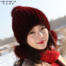冬季新款水貂毛帽子 狐狸毛球可爱护耳保暖帽毛线加厚皮草女帽