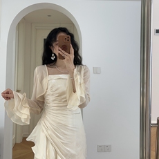 现货【一念飞花】白色拼接网纱开衫外套女夏新款雪纺印花吊带长裙