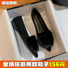 尖头毛毛单鞋女秋冬加绒2025新款黑色水貂毛棉瓢鞋大码女鞋41到43