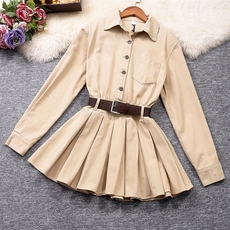 实拍秋季女装新款气质显瘦翻领衬衫连衣裙束腰带修身百褶大摆裙潮