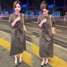 连衣裙女2025爆款新款中长款女装中国红风衣系腰带有口袋的衬衫裙