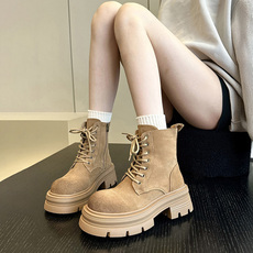 头层牛皮尖货~磨砂皮厚底粗跟增高马丁靴女工装靴显瘦系带短靴子