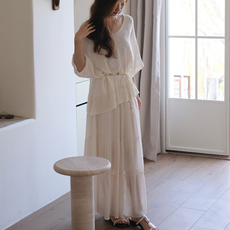 春季女装时尚套装裙子V领宽松中长袖镂空衫+天丝雪纺半身裙两件套
