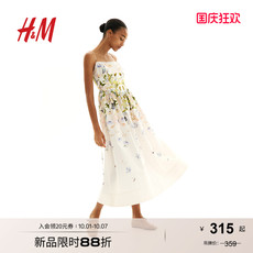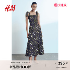 HM女装连衣裙秋季气质抽绳喇叭裙摆中长植物印花吊带长裙1233862