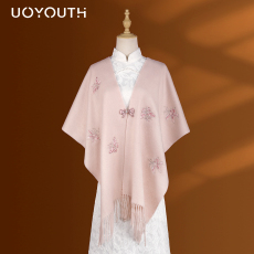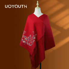 100%羊毛围巾秋冬季女围脖送长辈妈妈礼物兰花刺绣围巾酒红高级感