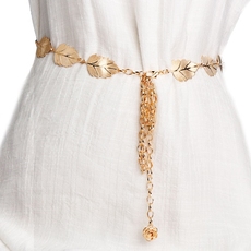 可调节漆皮金色树叶扣复古细腰带女士百搭装饰连衣裙牛皮真皮腰链