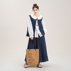 韩版蓝色刺绣镂空长袖衬衫女秋季新款慵懒风娃娃衫宽松系带上衣潮