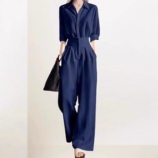 时尚气质蓝色套装女2025年秋装新款POLO领衬衫高腰直筒修身两件套
