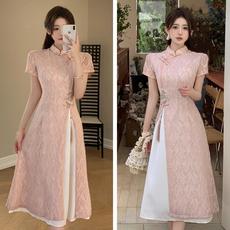 2025夏装新款中国风优雅时尚中长款改良版低领蕾丝旗袍连衣裙女装