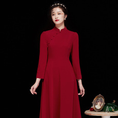 新中式酒红色改良旗袍女长袖2025春秋新款立领优雅日常显瘦连衣裙