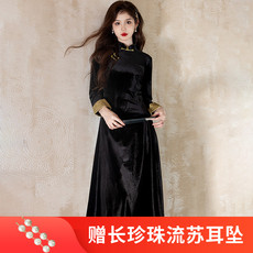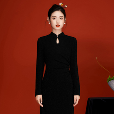 年会气质走秀长款旗袍女新款复古中国风长袖日常改良连衣裙黑色