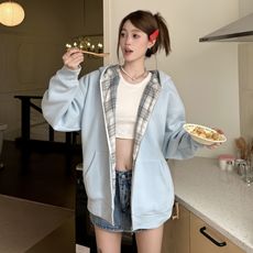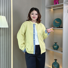 大码女装秋季新款胖mm撞色格子拼接设计感小众宽松卫衣外套棒球服